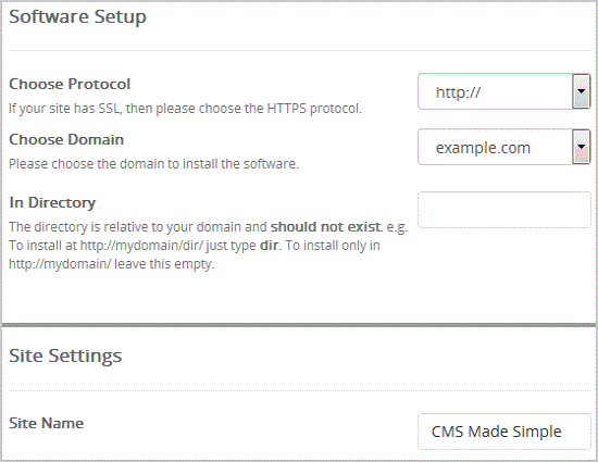 Choose Protocol: You can leave this as it is.Choose Domain: If you don't have multiple domains, leave this as it is.In Directory: If you want to install this in a directory, for example example.com/directory, enter the directory name. Otherwise, leave this blank to install in your main domain example.com