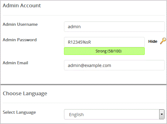 Admin Username: Your new CMS Made Simple username (for security reason do not use the "Administrator " or the "Admin " username.)Admin Password: Use a strong password.Admin Email: Your e-mail address.